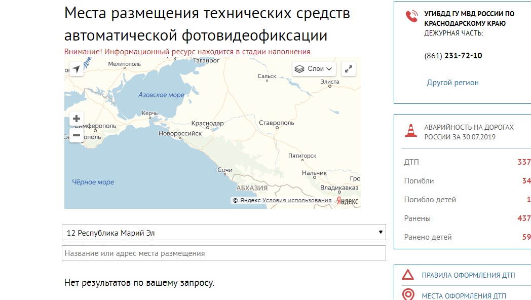 Данный сервис работает пока в тестовом режиме и находится в стадии наполнения. Попытка найти комплексы видеофиксации в Марий Эл результатов не дала.