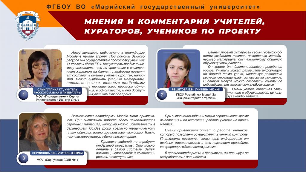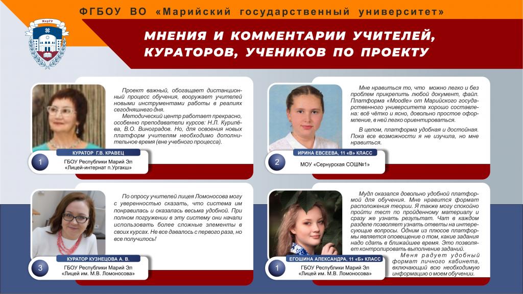 О позитивных результатах проекта свидетельствуют, прежде всего, итоги заключительного электронного опроса. Большинство учителей высоко оценивают полезность курсов для организации дистанционного обучения (средняя оценка — 4,72), качество занятий, организуемых командой преподавателей и сотрудников МарГУ (средняя оценка — 4,61), деятельность преподавателей-кураторов школ (средняя оценка — 4,75). А главное, 94,4% учителей рекомендовали бы своим коллегам пройти курсы повышения квалификации в дистанционном формате и использовать LMS Moodle для организации работы с учениками.