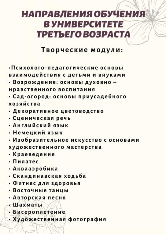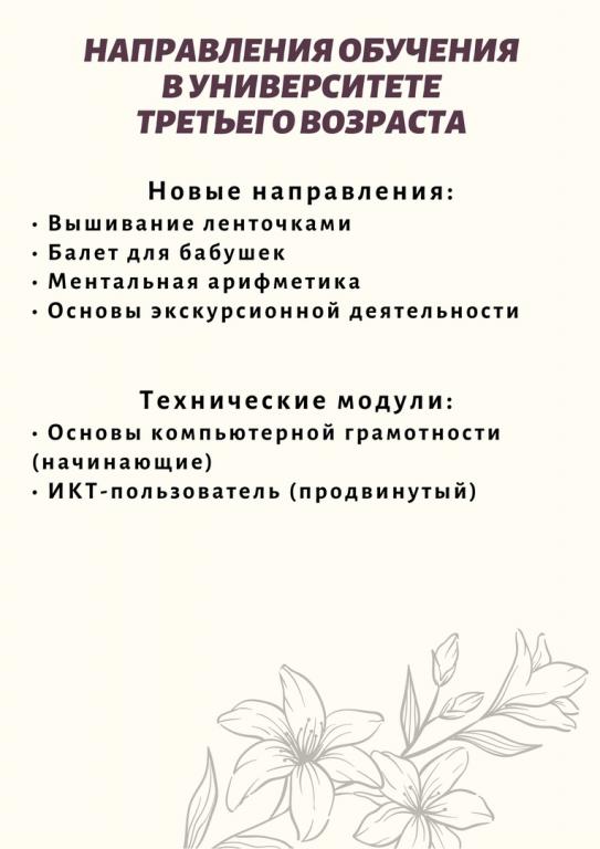 Все вопросы о порядке поступления и деятельности Университета третьего возраста можете задать по телефонам: 89278836693 и
