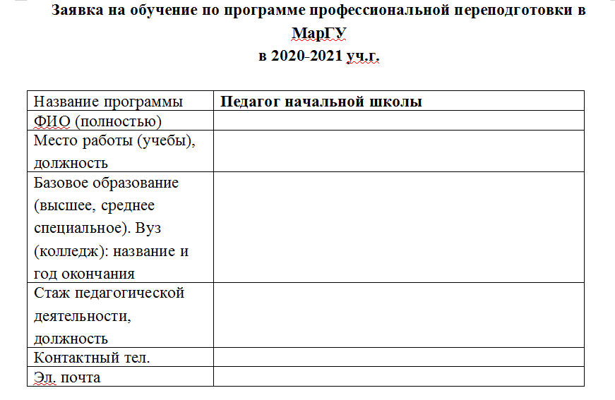 Для зачисления в качестве слушателя программы «Педагог начальной школы» необходимо заполнить заявку по прикреплённой форме и отправить ее по адресу: kafmno@marsu.ru