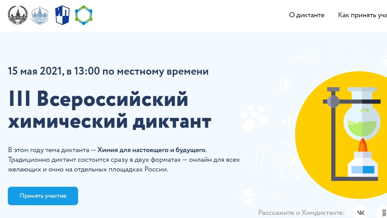 III Всероссийский химический диктант в этом году пройдёт в субботу, 15 мая. В этом году тема диктанта: «Химия для настоящего и будущего».