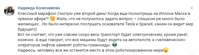 Жительнице Йошкар-Олы Надежде Колесниковой марафон очень понравился. Она оставила позитивный комментарий.