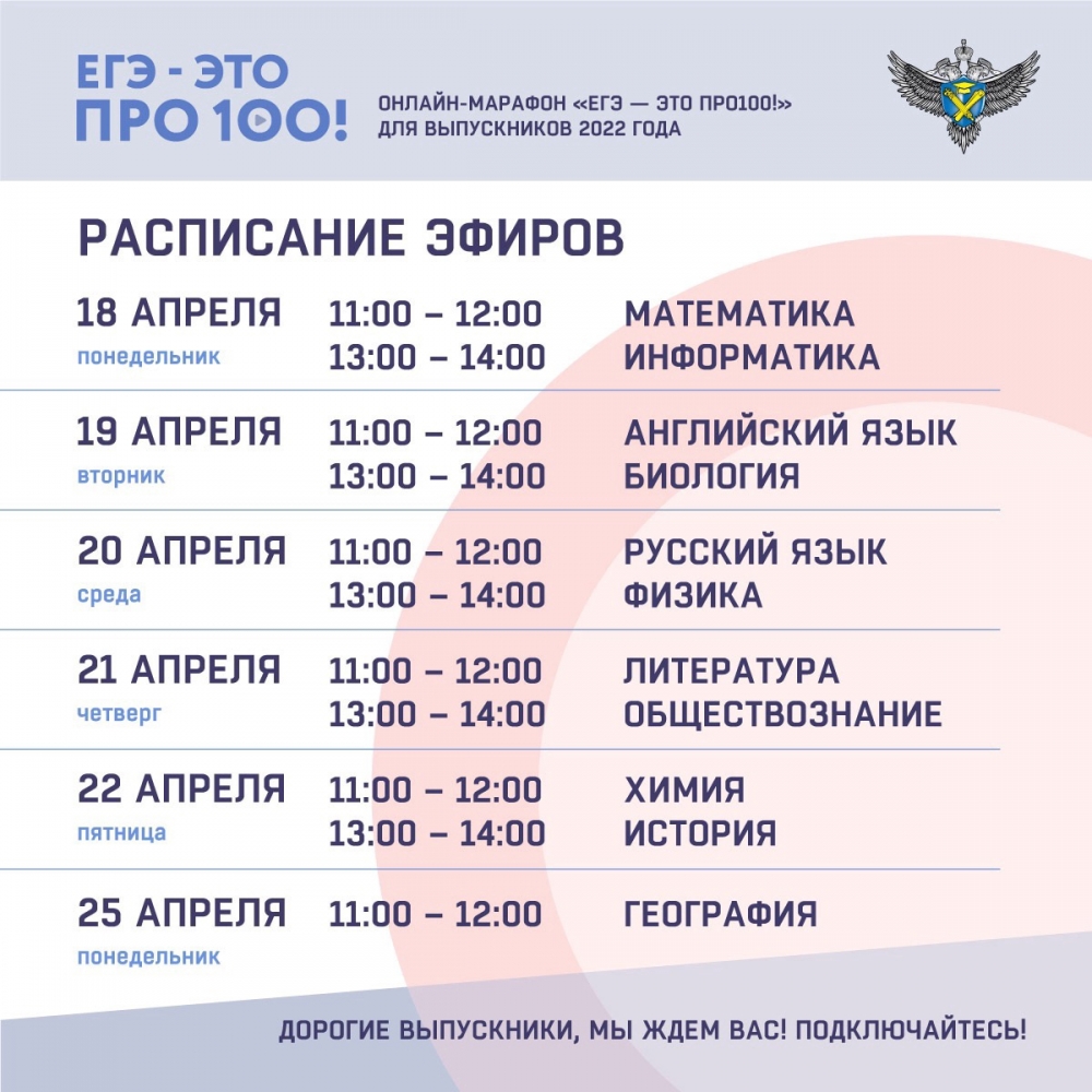 Совсем скоро выпускники будут сдавать единые государственные экзамены. Чтобы помочь школьникам разобраться в заданиях ЕГЭ, понять, как эффективнее выстроить стратегию подготовки и действовать во время экзаменов, Рособрнадзор уже во второй раз запускает марафон: «ЕГЭ — это про100!».