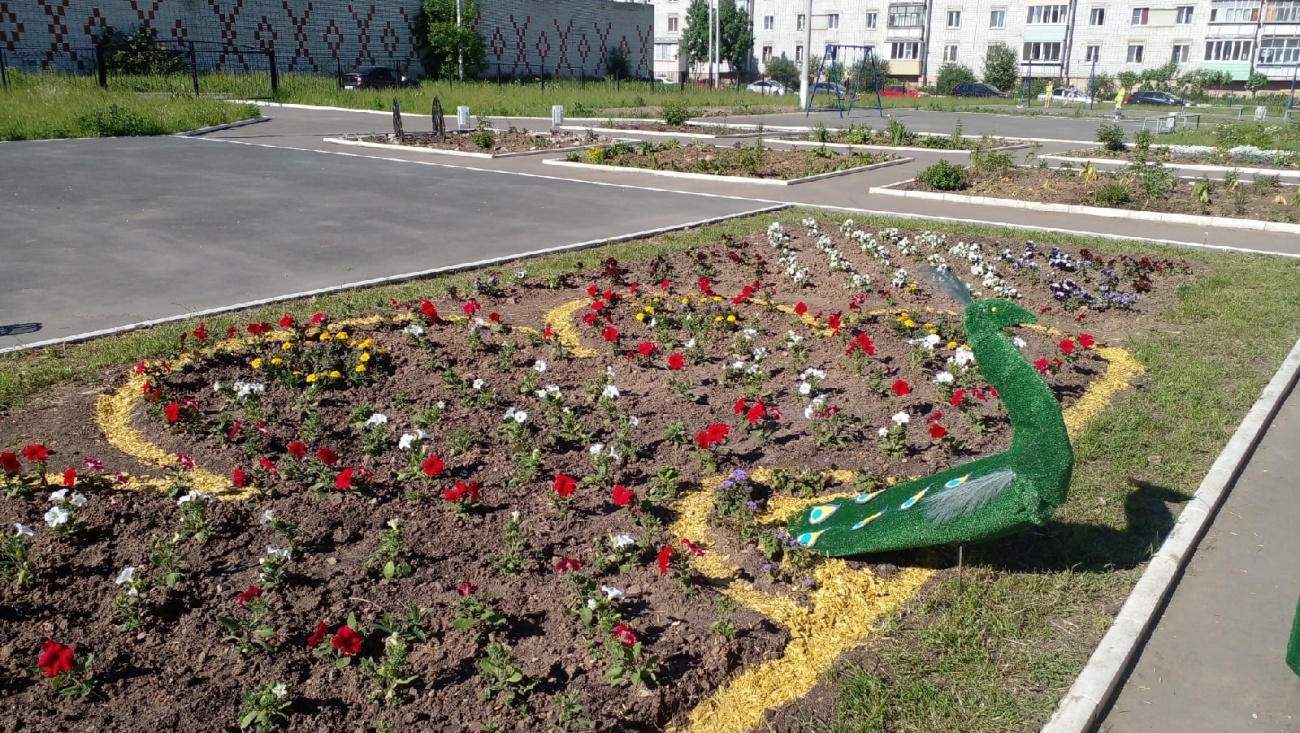 Необычная клумба появилась на участке школы № 31 в Йошкар-Оле. Один из цветников украсил величавый павлин, хвост которого имитируют высаженные растения.