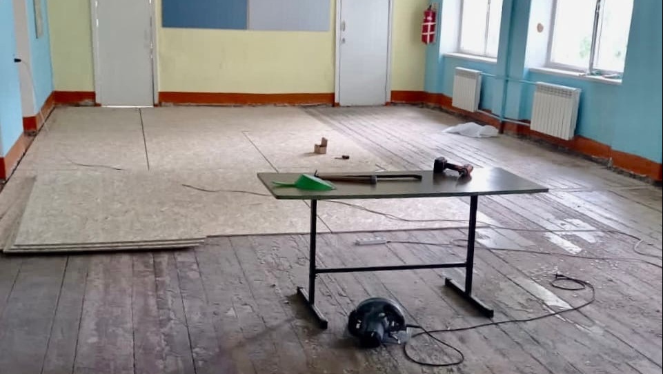 Сейчас здесь полным ходом готовятся к новому учебному году. В рекреациях 1-3 этажей ремонтируют полы. Подрядчики укладывают основание и новый линолеум.