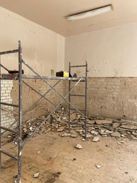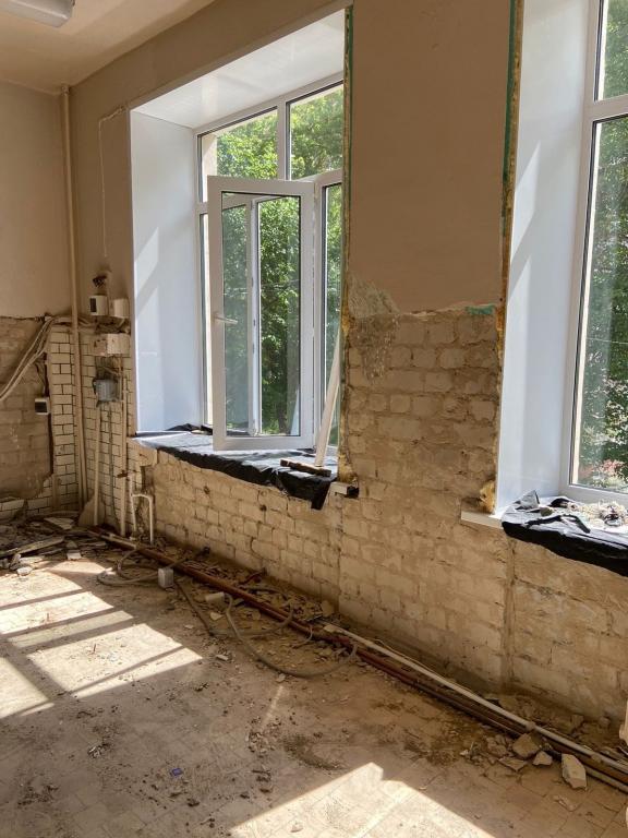 В настоящее время подрядчики разбирают покрытие полов и облицовку стен. К началу занятий здесь уложат новую плитку, заменят светильники, обновят электропроводку и сантехническое оборудование, заменят радиаторы отопления.