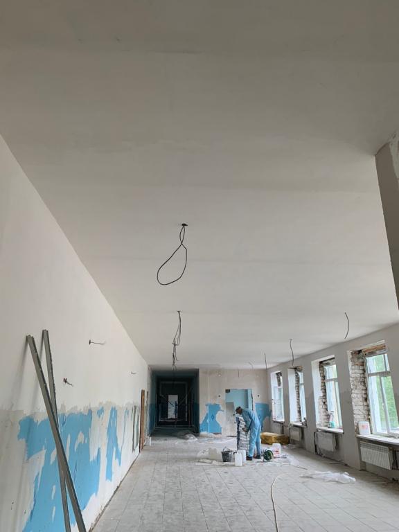 Завершаются работы по ремонту фасада здания школы, инженерных сетей, ремонту полов. Внутренние помещения готовятся к покраске. Ведется ремонт пищеблока, спортивного и актового залов.