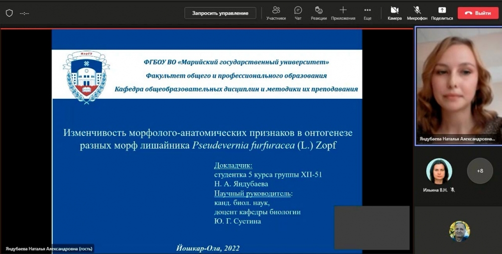 Финал конкурса проводился дистанционно с использованием платформы Microsoft Teams. Для участия в финале жюри конкурса отобрало 8 работ. Яндубаева Наталья представила на конкурс научно-исследовательскую работу «Изменчивость морфолого-анатомических признаков в онтогенезе разных морф лишайника Pseudevernia furfuracea (L.) Zopf (Республика Марий Эл)», выполненную под научным руководством доцента кафедры биологии, кандидата биологических наук Суетиной Юлии Геннадьевны.