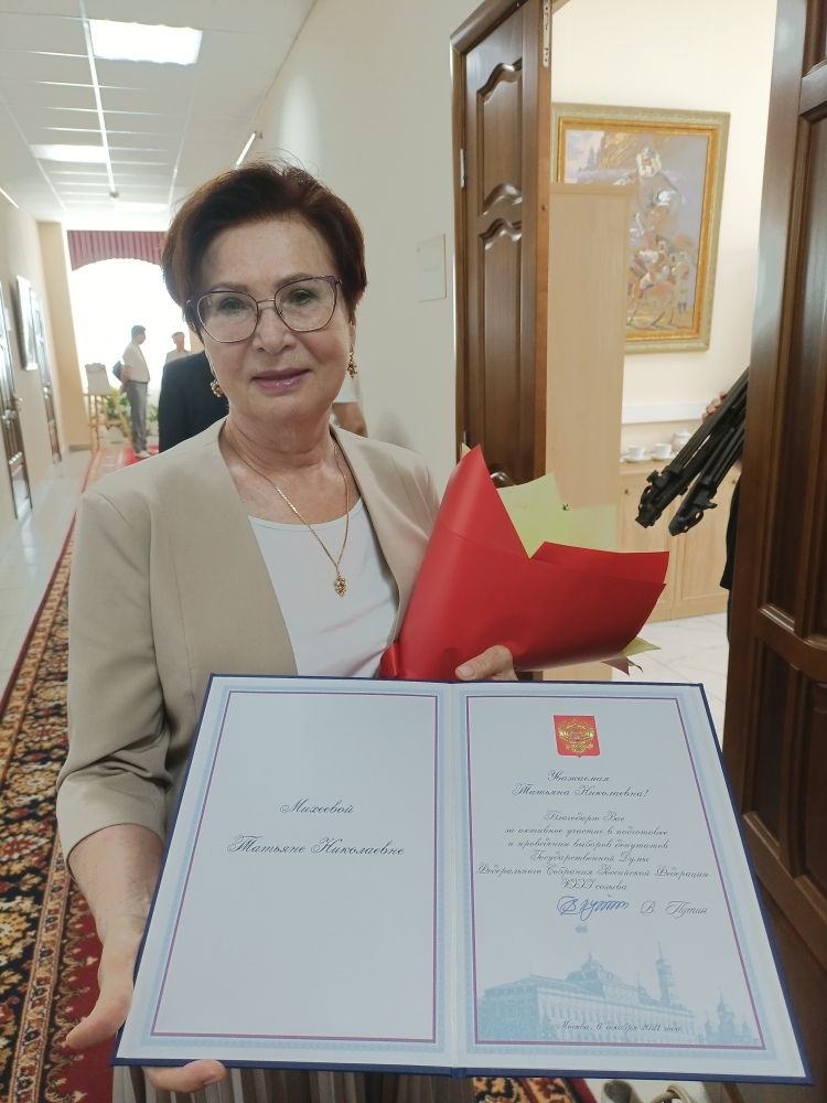 В завершение рассмотрения вопросов повестки состоялось вручение нескольким членам Общественной палаты Благодарственных писем Президента Российской Федерации за участие в организации и проведение выборов депутатов Государственной Думы РФ. В их числе и Татьяна Михеева, член Палаты, профессор кафедры конституционного и административного права Марийского государственного университета.