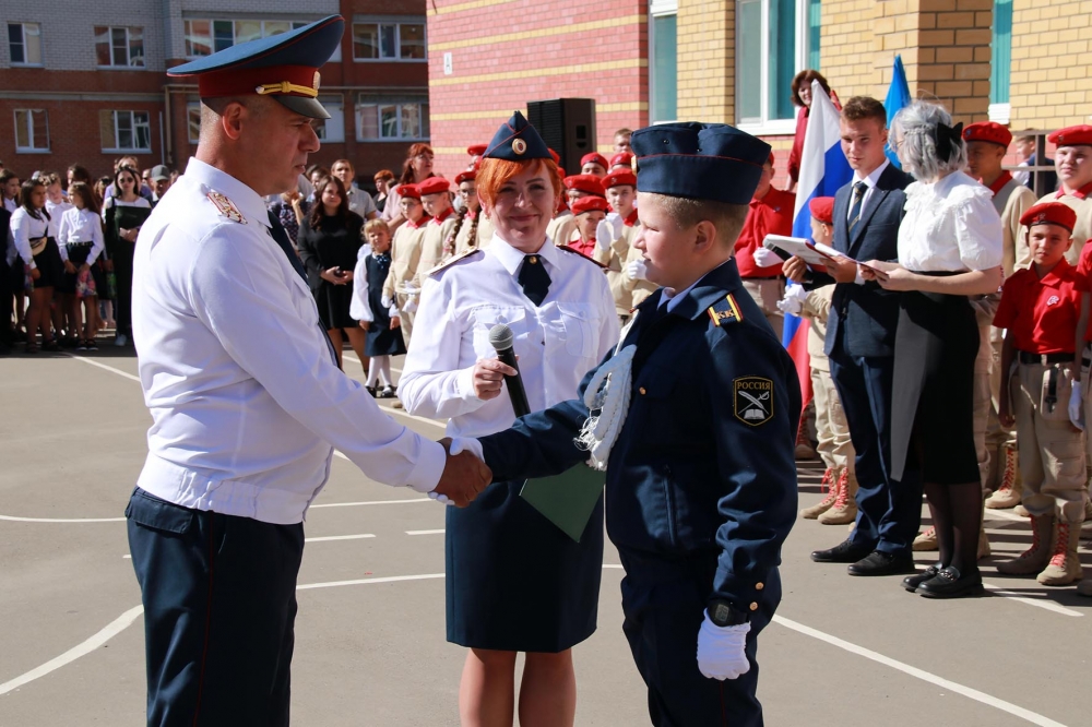 На торжественной линейке представитель ведомства вручил нагрудные знаки «Лучший кадет УИС» за успехи, достигнутые в прошлом учебном году Артему Ковешникову, Анастасии Бутениной и Милене Романовой.