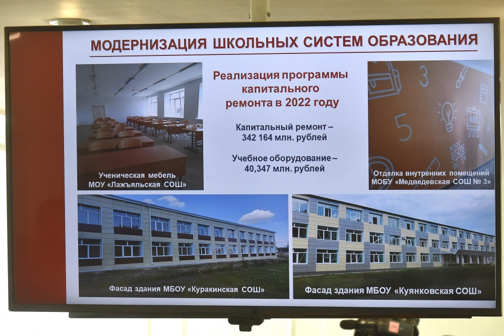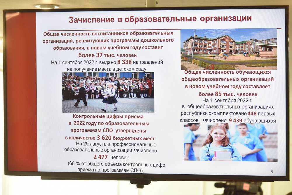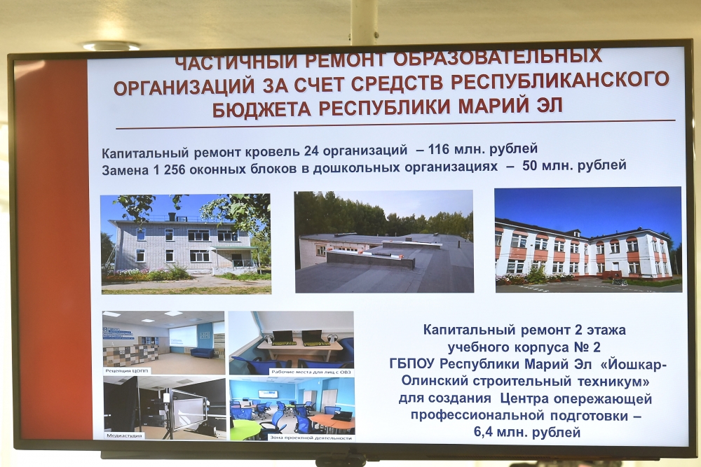 Министр образования и науки республики Лариса Ревуцкая доложила Юрию Зайцеву об открытии двух новых школ — в Медведевском и Мари-Турекском районах. Кроме того, завершён капитальный ремонт в шести школах. На эти цели было направлено более 378 млн рублей.