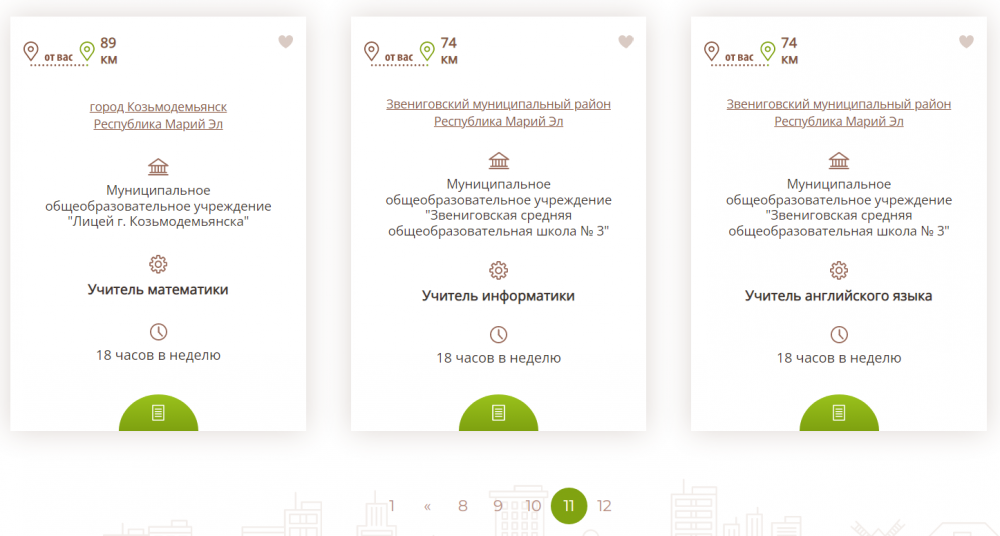 Сейчас в «банке вакансий» Марий Эл нехватка на селе учителей математики, физики, химии, ИКТ, технологии, русского языка и литературы. Есть потребность в учителях физкультуры, например: в «Микряковской средней общеобразовательной школе» и «Мари-Турекской средней общеобразовательной школе». В «Сернурской СОШ № 1 имени Героя Советского Союза А.М.Яналова» и Красногорских школах № 1 и № 2 нехватка учителей начальных классов.