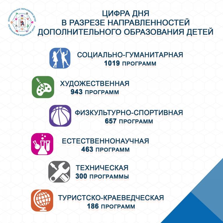Самые востребованные — программы социально-гуманитарного направления, помогающие получить гуманитарные знания и развить универсальные навыки. На втором месте — программы художественной направленности, ориентированные на развитие творческих способностей. Далее следуют программы физкультурно-спортивного направления, нацеленные на физическое развитие детей и приобщение их к здоровому образу жизни, а также программы естественнонаучного направления. Замыкают рейтинг технические и туристско-краеведческая программы.