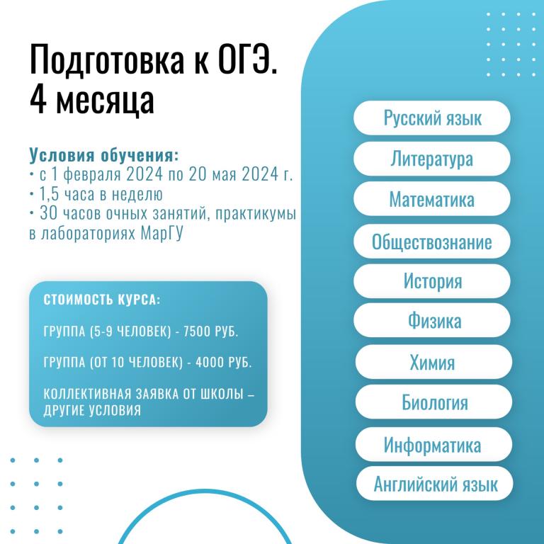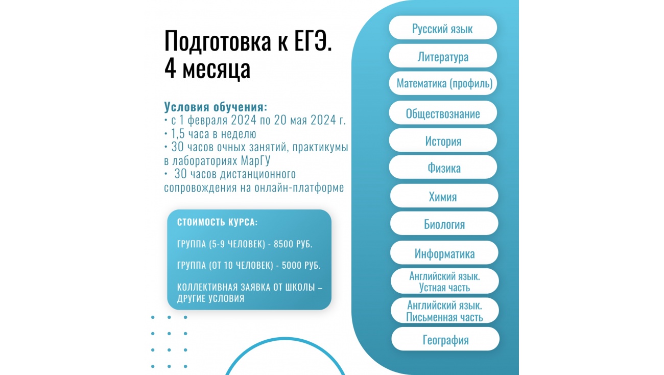 Преподаватели Центра являются докторами и кандидатами наук, профессорами и доцентами специализированных кафедр МарГУ, имеющими колоссальный опыт подготовки обучающихся по профильным предметам. К тому же при условии поступления в МарГУ вуз гарантирует вернуть 100% стоимости обучения в виде стипендий на 1 курсе обучения (кэшбек действует на определённые ДОП по предметам и направления подготовки).