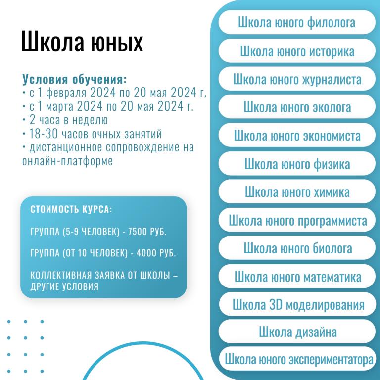 - Школа юных: филолога, историка, журналиста, эколога, экономиста, физика, программиста, биолога, математика, дизайна, экспериментатора