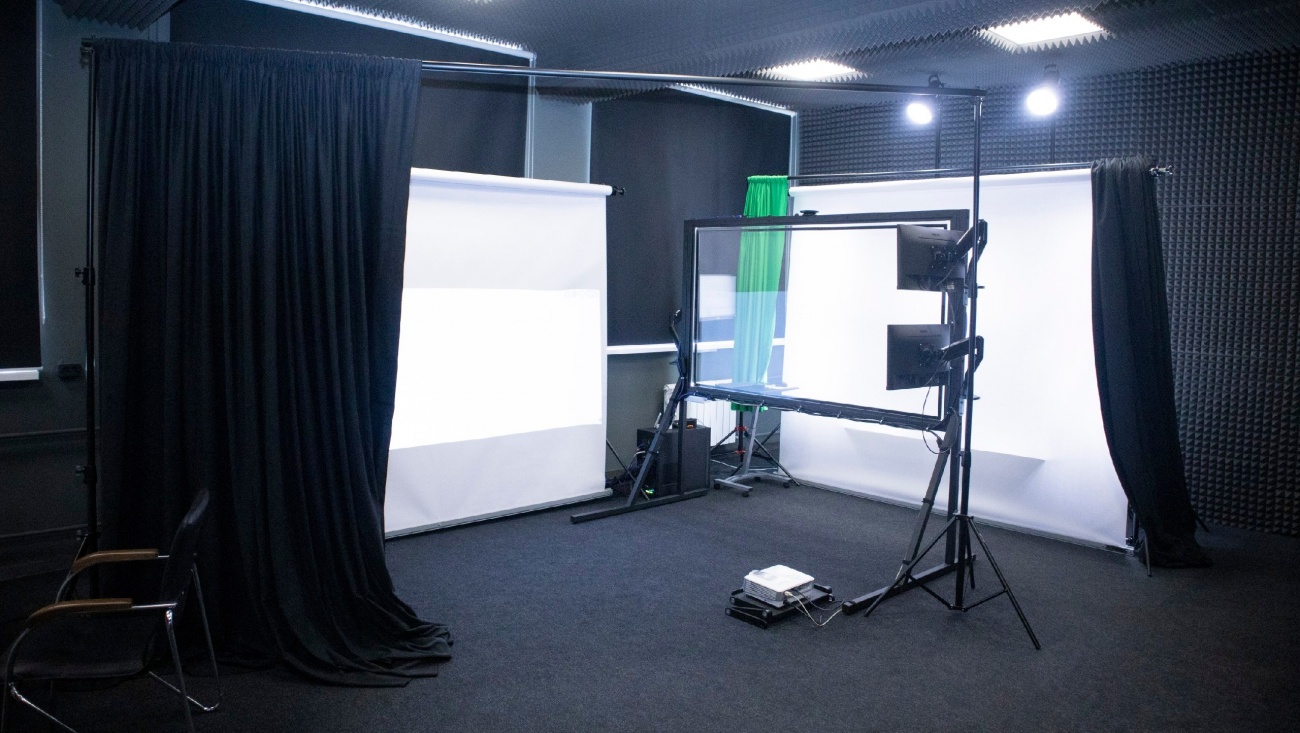 Профессиональная видео — камера, освещение, мониторы, суфлер, доска с led — подсветкой, на которой можно вести записи, фоны разных цветов, хромакей, радио-микрофоны — в студии есть всё для того, чтобы любой желающий из числа студентов или преподавателей мог записать урок, видеокурс или вебинар.