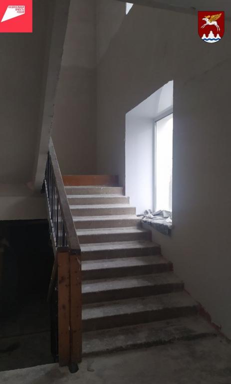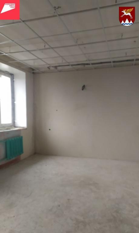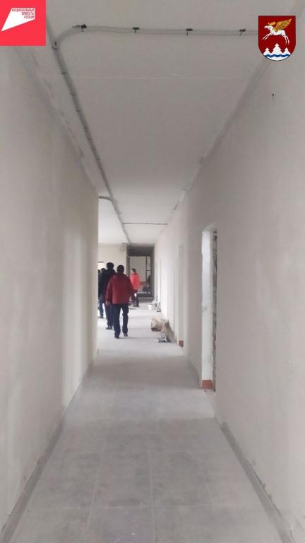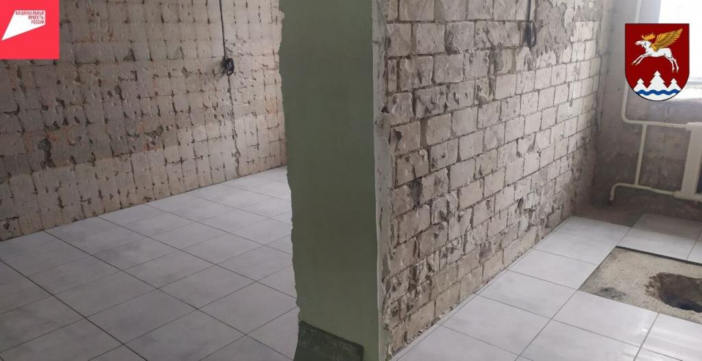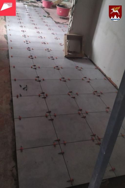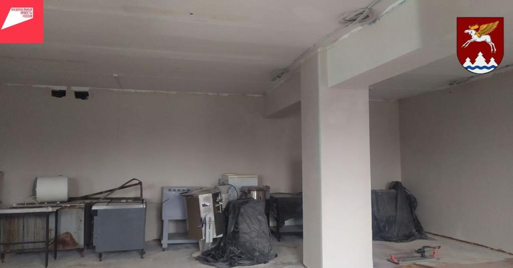 Сейчас подрядная организация готовит поверхности стен для отделки. В столовой укладывают плитку на пол, а в кабинетах проводится монтаж навесного потолка.