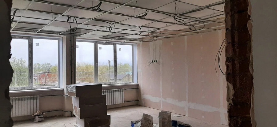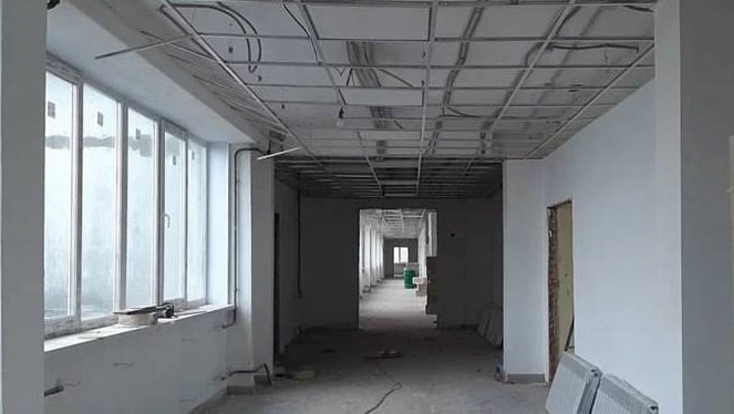 На данный момент здесь уже выполнили демонтаж, установили оконные блоки, обновили канализацию и отопление в подвале, выполнили стяжку под полы, теплосети. Подходят к завершению штукатурные работы на 1-3 этажах, установка пожарной сигнализации, устройство потолков.