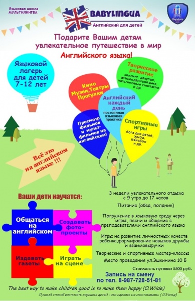 МариМедиа, 5 июня. Каждому человеку хочется овладеть иностранными языками, легко и непринужденно общаться на другом языке, однако проще всего это удается детям благодаря погружению в творческую игру, чередуя занятия с посещением кинотеатров, музеев и зоопарков, играми на свежем воздухе и занятиями спортом. Именно так изучают английский язык маленькие йошкаролинцы в летнем лагере «БейбиЛингва». (http://technolingua.marimedia.ru/)