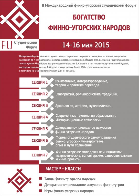 МариМедиа, 6 мая. 14-16 мая на базе Марийского государственного университета (http://marsu.ru/meropriyatiya/forum2fun/) пройдет второй международный студенческий форум «Богатство финно-угорских народов». Форум призван объединить финно-угров и специалистов в этой области как в нашей стране, так и за рубежом. В мероприятиях примут участие студенты и аспиранты из российских субъектов, гости из Германии и Финляндии. Участники обсудят проблемы языкознания и литературы, археологии, этнографии, фольклористики, изобразительного искусства, а так же технологии образования, социальные аспекты, поделятся опытом студенческих инициатив: патриотических, волонтерских, туристических.