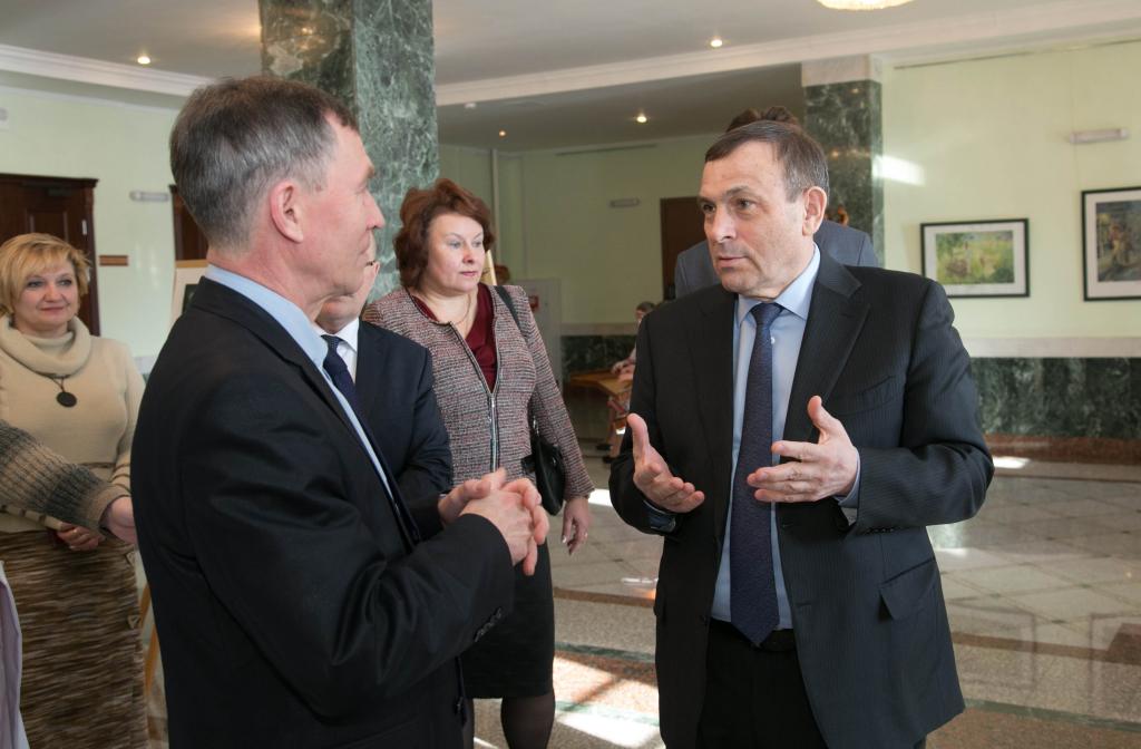 Перед концертом Глава республики посетил выставку, на которой были представлены художественные работы учеников и выпускников учебного заведения — на холсте, в скульптуре, резьбе по дереву, в графике, вышивке.