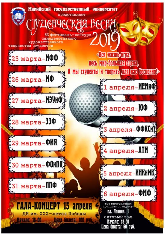 С 25 марта по 6 апреля в Марийском государственном университете пройдет фестиваль студенческого творчества «Студенческая весна — 2019». Все выступления в рамках фестиваля будут объединены общей темой, перекликающейся с Годом театра, объявленного в России.