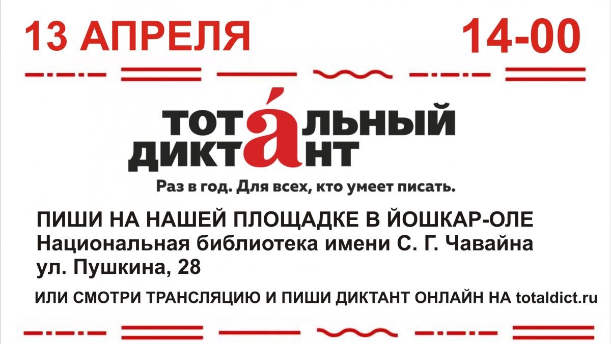 Теперь к площадкам МарГУ присоединилась ещё одна. Все желающие проверить свою грамотность могут прийти 13 апреля в Национальную библиотеку имени С. Г. Чавайна и написать «Тотальный диктант».