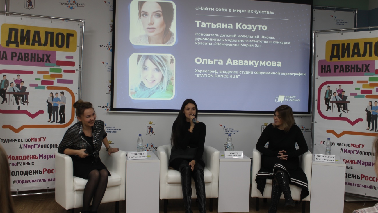 Тема «Найти себя в мире искусства» была раскрыта спикерами студенческого клуба «Диалог на равных» Ольгой Аввакумовой и Татьяной Козуто. Род их деятельности тесно соприкасается с искусством. Ольга занимается хореографией, а Татьяна учит девочек от 4 до 16 лет искусству моды.