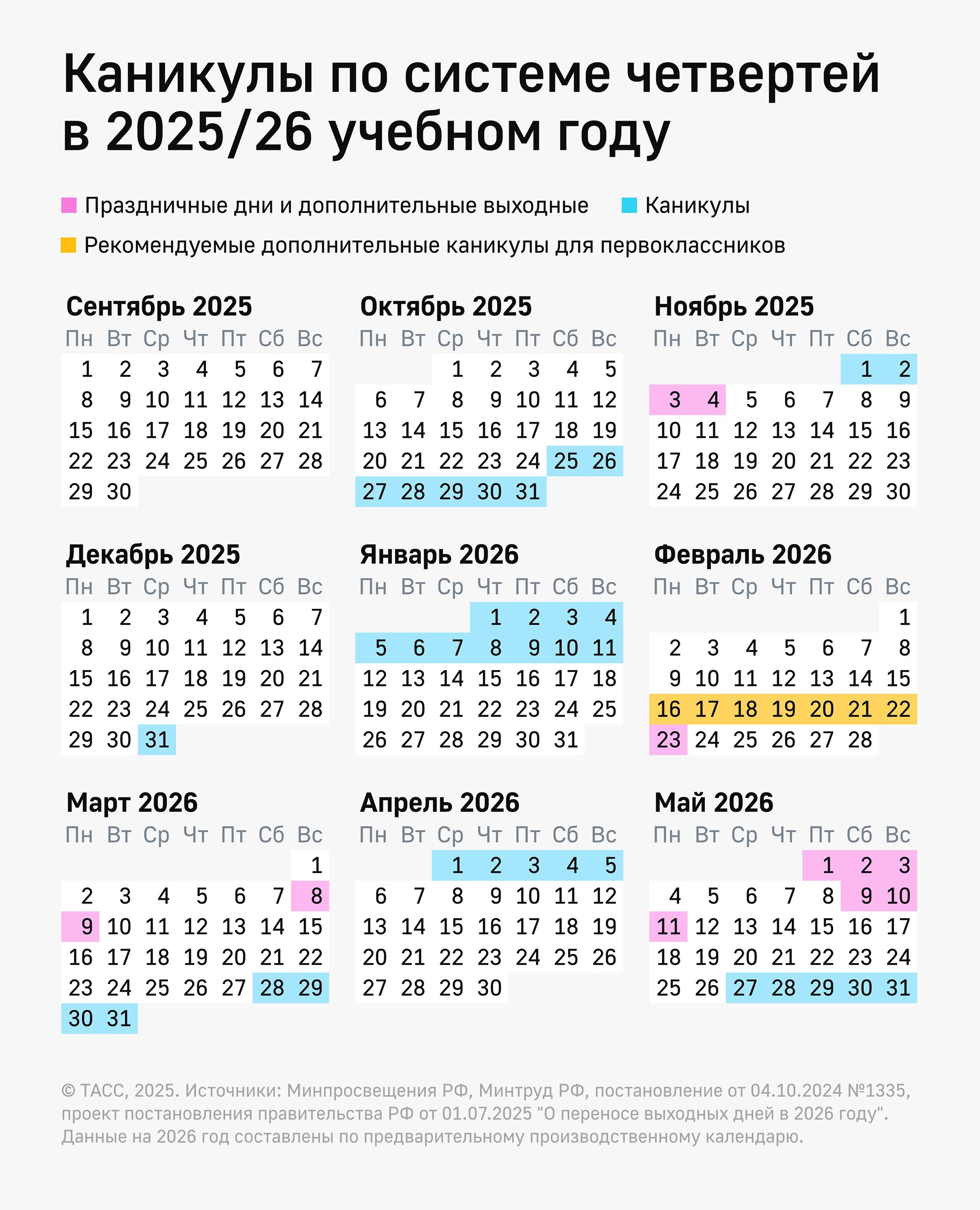 Что касается летнего отдыха, в 2026 году школьные каникулы начнутся 27 мая и продлятся по 31 августа.