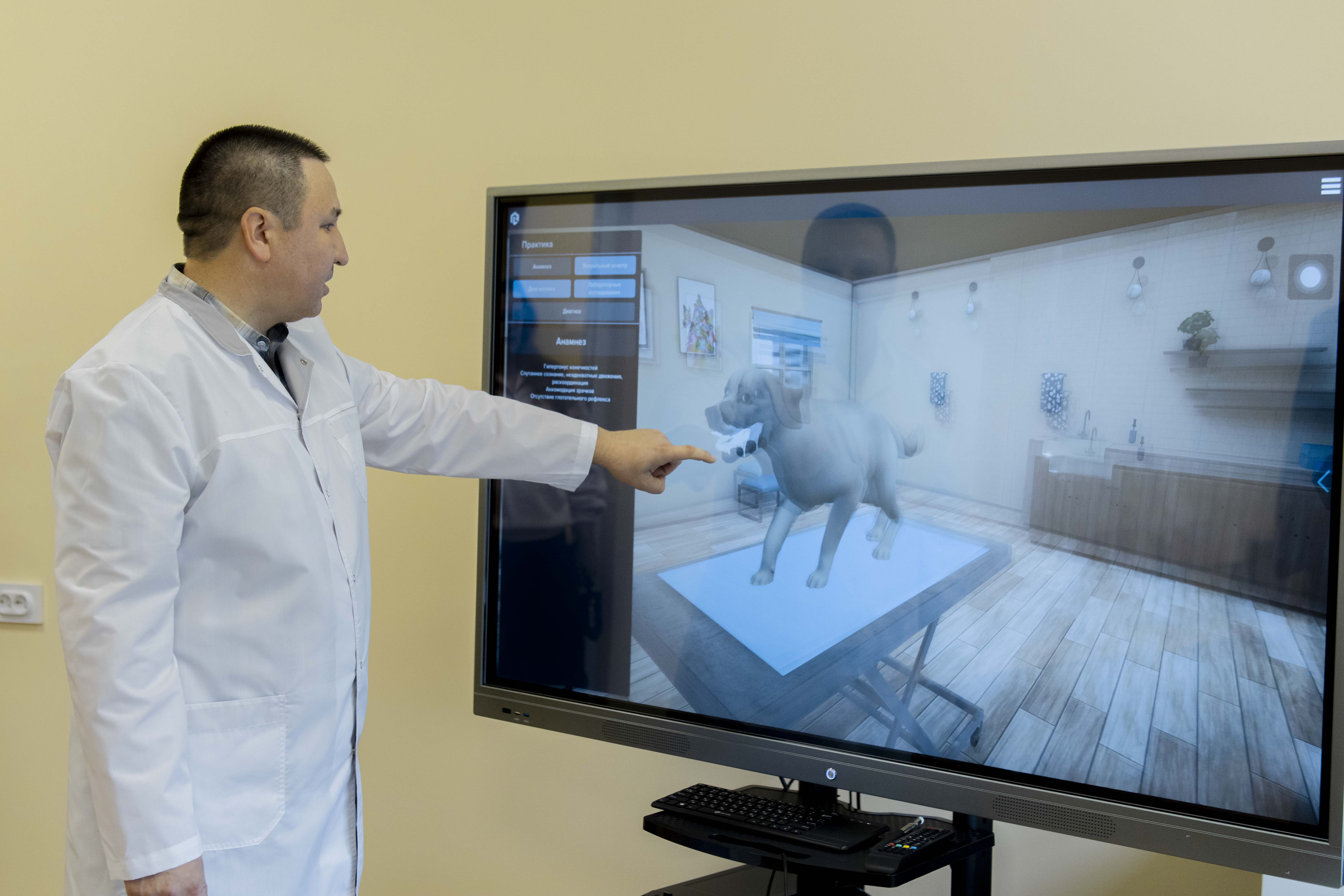 Ключевой элемент кабинета — виртуальный тренажер ветеринарного врача. Программа на базе трёхмерной графики и анимации имитирует полноценный клинический приём: студенты проводят виртуальный осмотр, выполняют инструментальные исследования и ставят первичный диагноз по заранее проработанным сценариям. Система охватывает диагностику заболеваний свиней, крупного рогатого скота и собак. Интерактивные 3D-модели животных реагируют на манипуляции в реальном времени, что позволяет обучаемым последовательно выполнять стандартные процедуры, формировать диагноз и выбирать оптимальную стратегию лечения.
