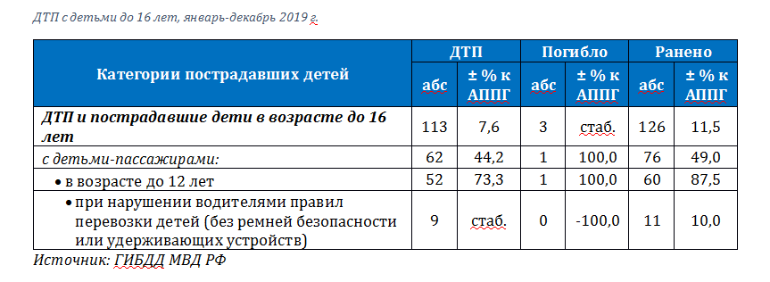 Так, согласно аналитической справке в 2019 году на территории республики Марий Эл с участием детей и подростков в возрасте до 16 лет зарегистрировано 113 дорожно-транспортных происшествий, в результате которых 3 детей погибло, 126 несовершеннолетних получили травмы. Зафиксирован рост количества ДТП с детьми-пассажирами в возрасте до 12 лет на 73,3%, рост количества погибших детей-пассажиров до 12 лет — на 100%.