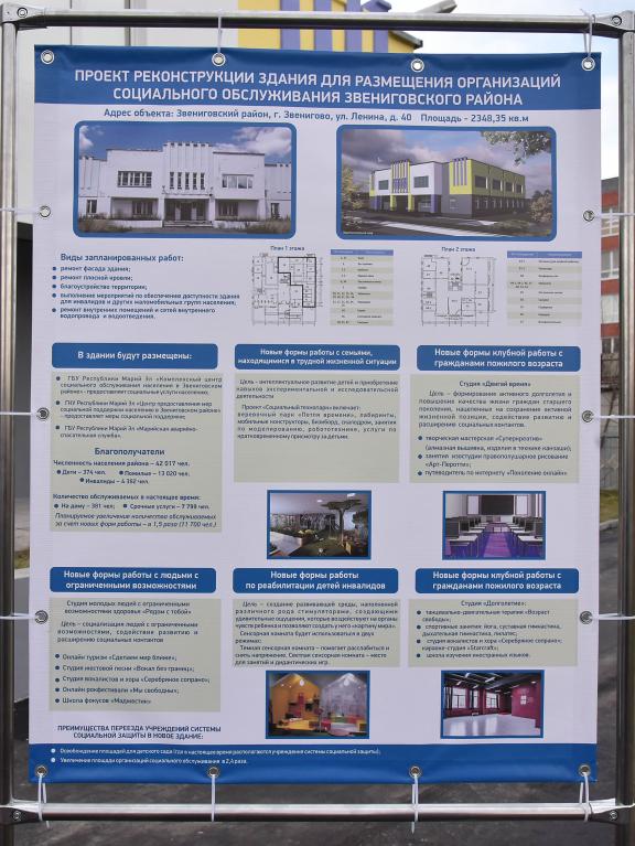Ещё один объект социального назначения, который посетил Глава Марий Эл в ходе рабочей поездки, расположен в Звенигове. В городе ведётся ремонт здания куда переедет Комплексный центр социального обслуживания населения и Центр предоставления мер социальной поддержки населению. Сейчас центры социальной защиты располагаются в здании муниципального детского сада.