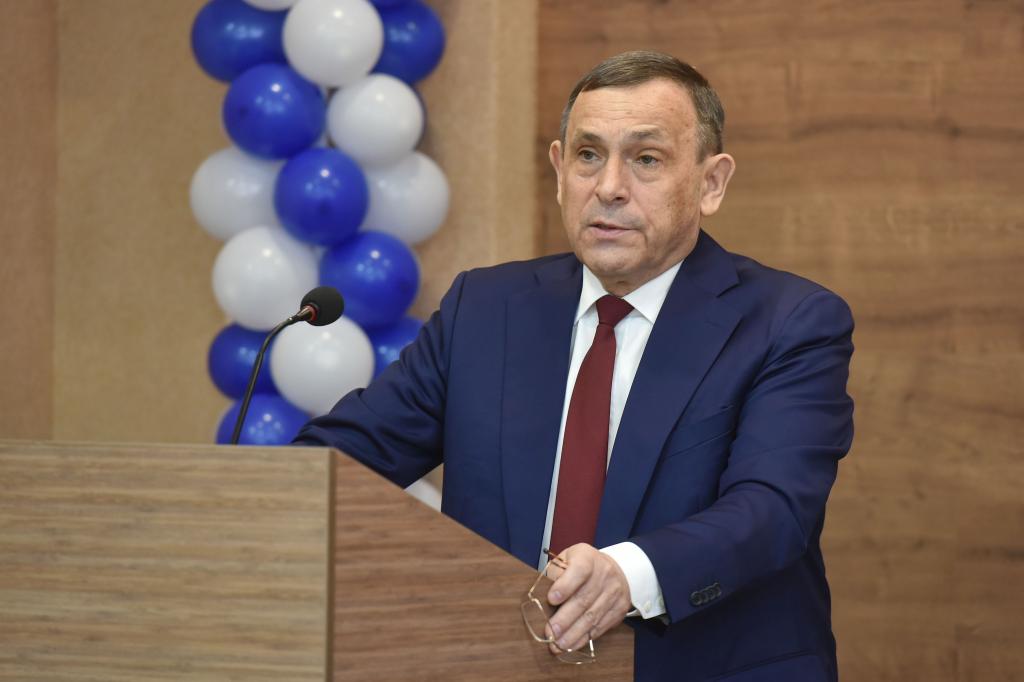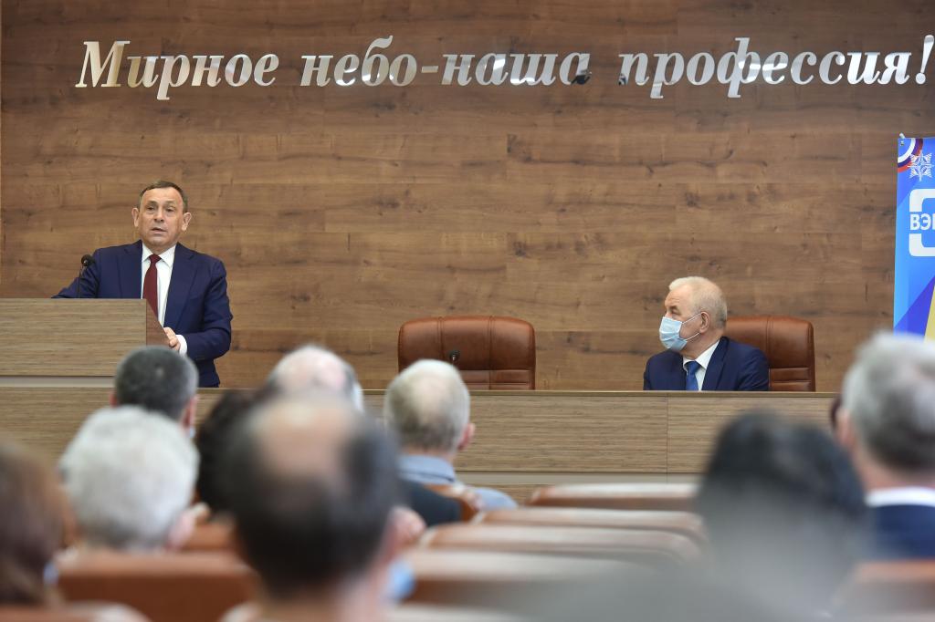 В актовом зале Александр Евстифеев поздравил работников Волжского электромеханического завода с юбилеем предприятия, отметив, что оно стабильно развивается и имеет славную историю.