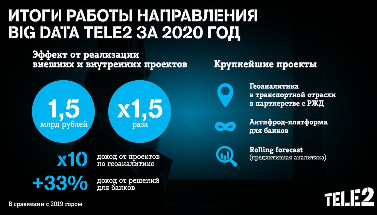 Tele2 подводит итоги работы направления big data за 2020 год. Эффект от реализации внешних и внутренних проектов по аналитике вырос в 1,5 раза и составил 1,5 млрд рублей. При этом доход от внешней монетизации увеличился в 2 раза. Драйверами роста выручки стали продукты геоаналитики и проекты для финансовых организаций.
