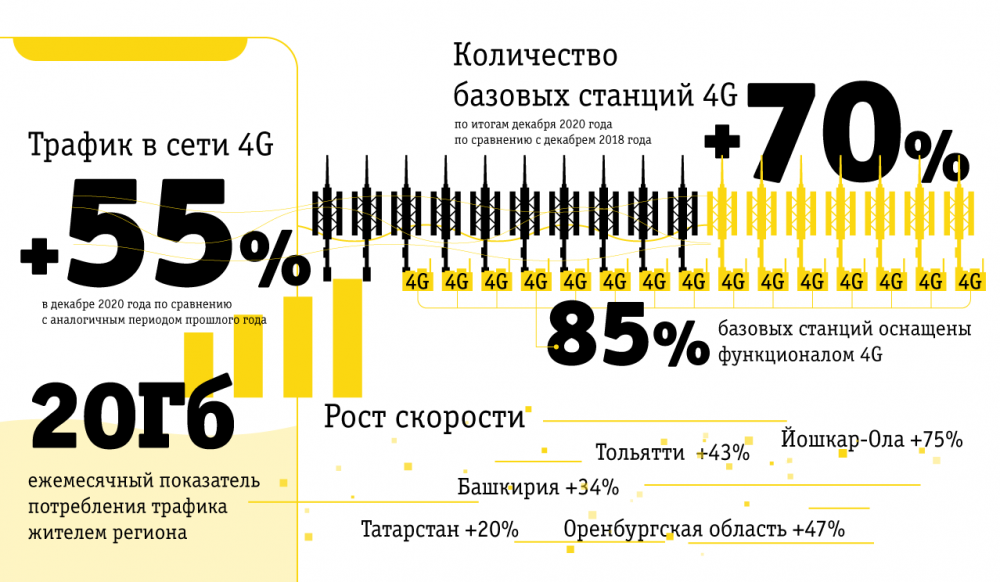 За 2020 год компания показала темп прироста сети LTE на 15%, а за последние два года количество 4G базовых станций в Центральном регионе выросло на рекордные 70%. Сейчас уже около 85% базовых станций оператора оснащены технологией 4G.