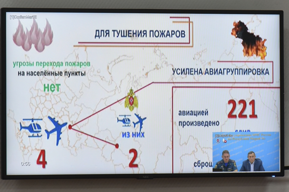 «На совещании отмечено снижение числа участков, где бушует открытый огонь. Основной вопрос, который нас беспокоил — сохранение решения руководства МЧС России о работе в республике двух вертолётов федерального ведомства. Всего у нас сейчас работает четыре вертолёта. Работа идёт в плановом порядке. Количество физической силы достаточно. Уверен, ситуация вскоре будет окончательно управляемой», — сказал глава Марий Эл по итогам селекторного совещания.