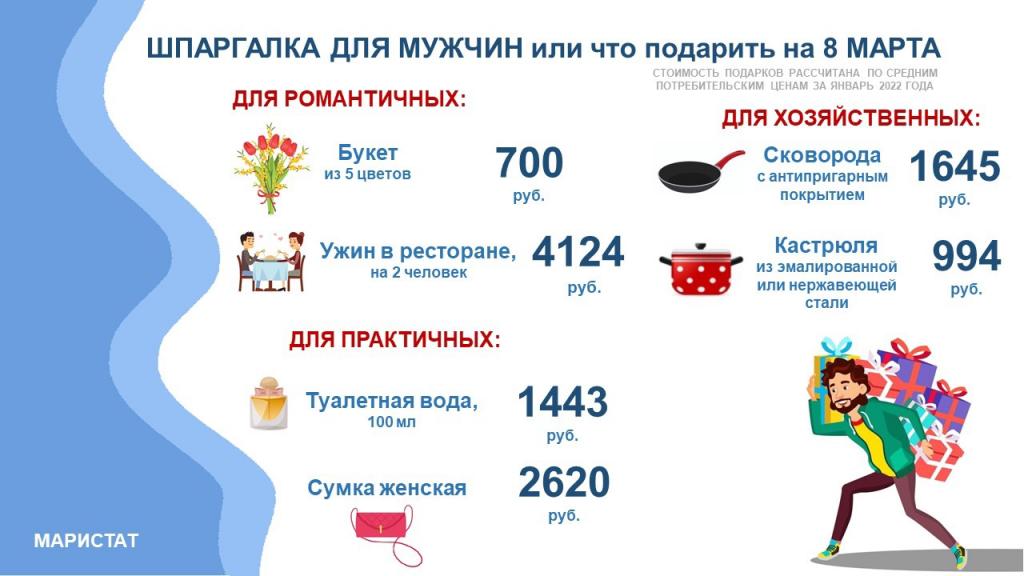 В преддверии 8 Марта Маристат подготовил шуточную шпаргалку для мужчин о том, какие подарки для любимых женщин можно приобрести и по какой цене.