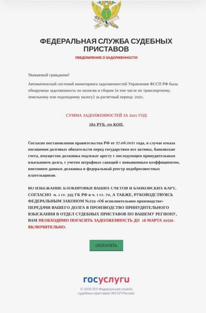 Злоумышленники присылают на электронную почту граждан письма о наличии задолженности, которую необходимо срочно оплатить. Также в фальшивых уведомлениях указываются меры принудительного характера в виде ареста банковских счетов и имущества, в случае неуплаты долга.
