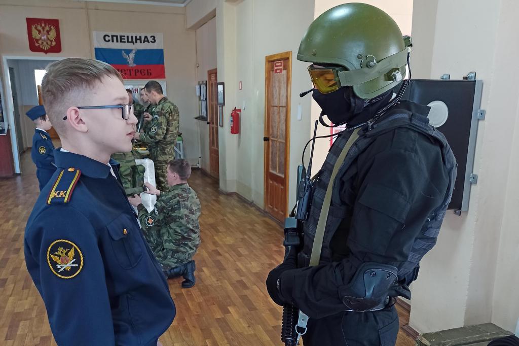 Начальник отдела «Ястреб» Дмитрий Загайнов рассказал кадетам об истории боевого подразделения, которое уже больше тридцати лет стоит на страже правопорядка и служебных задачах, которые выполняет спецназ.