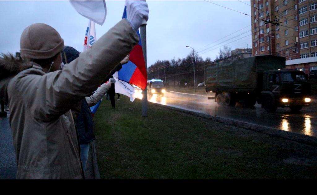 Собравшиеся с радостными приветствиями встречали колонну военной техники, которая двигалась по улице Карла Маркса с флагами России и патриотическими плакатами «Своих не бросаем». Проезжающие мимо автомобили сигналили в знак поддержки росгварднйцев.