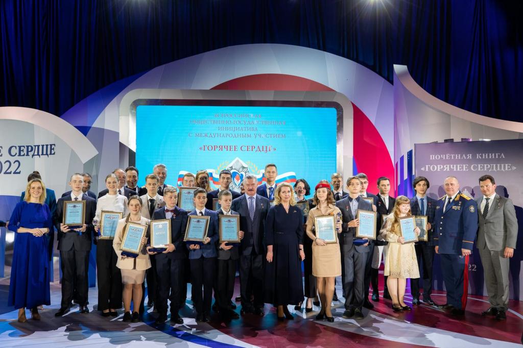 Торжественная церемония награждения лауреатов Всероссийской общественно-государственной инициативы с международным участием «Горячее сердце-2022» состоялось в московском Музее Победы 18 мая. Почётные знаки и дипломы вручили школьникам и студентам, которые, несмотря на юный возраст, показали пример отваги и мужества. В Зале Славы наградили 20 лауреатов из России, Белоруссии и Абхазии.