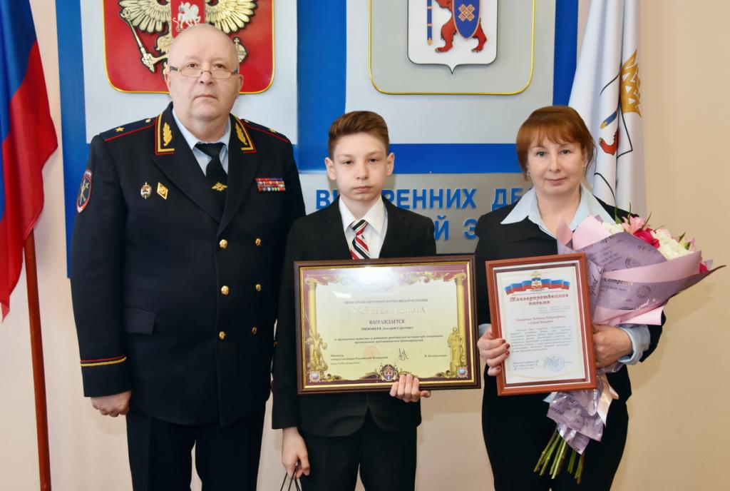 В числе награждённых 13-летний школьник из Йошкар-Олы Дмитрий Тимофеев. Благодаря неравнодушию и бдительности Дмитрия полицейским удалось задержать по горячим следам злоумышленника, похитившего смартфон у первоклассницы, и доказать его причастность к грабежу.