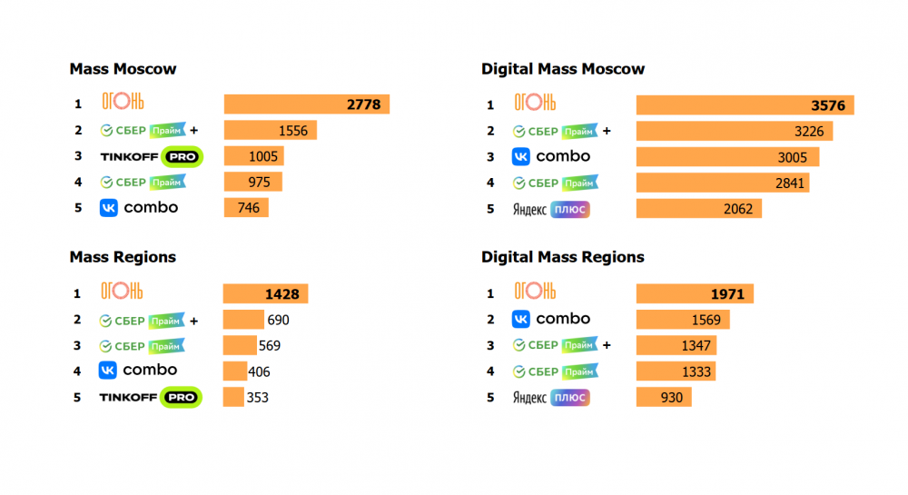 Всего в исследование вошли 12 подписок. Самой выгодной из них аналитики назвали «Огонь» (оператор подписки — компания «Сеть партнерств»), которая появилась всего год назад. В отличие от большинства участников рейтинга, она мультибрендовая, то есть объединяет множество крупных независимых партнеров, а не строится вокруг одной «материнской» компании.