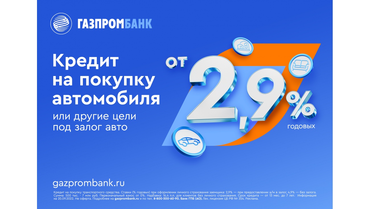 Газпромбанк снизил ставки по кредитам на покупку автомобиля и на любые цели под залог авто. Теперь на любую сумму кредита и при любом способе подаче заявки действует единая ставка: 2,9% годовых — при оформлении автомобиля в залог, 4,9% годовых — без залога. Ставка указана при наличии личного страхования заемщика.