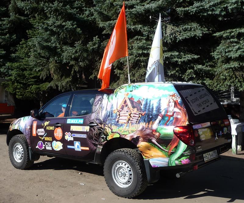 Олег Радул, участник кругосветки, рассказал Marimedia.ru, что цель поездки была исключительно некоммерческая. В середине мая 2011 со стороны Чебоксар в Йошкар-Олу заехал обычный черный Mitsubishi L200, а на следующий день по этой же дороге уезжал необычный сказочный автомобиль. Оформление авто подарили путешественникам йошкаролинцы. Он украшен изображениями героев русских народных сказок, среди которых почетное место занимала «Бабка Йошка».