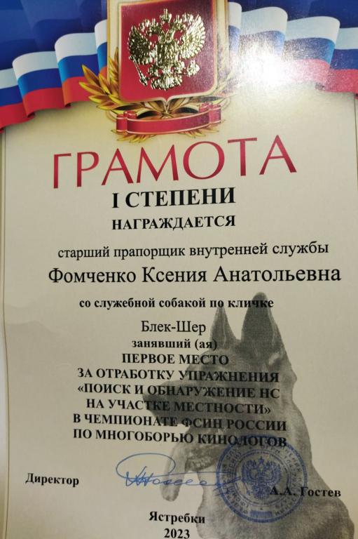 Как выяснилось, обоняние Блека имеет все необходимые для этого качества. Это не только его природная одарённость, но и заслуга старшего прапорщика внутренней службы Ксении Фомченко, которая уделяет выучке и дрессировке собаки и служебное, и свободное время. Победа в одном из самых сложных упражнений на чемпионате ФСИН России стала заслуженной наградой для профессиональных напарников.