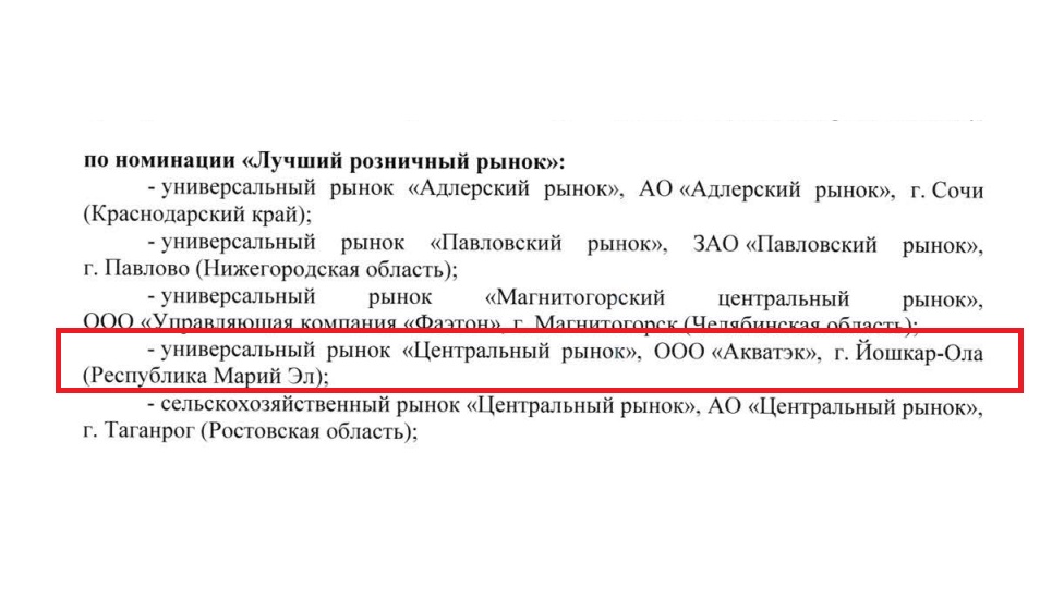 «Центральный рынок» Йошкар-Олы оказался в числе 15 победителей в номинации «Лучший розничный рынок». Наш рынок ничем не уступает универсальному рынку Сочи. Рынкам из Таганрога, Томска, Калининграда и других.