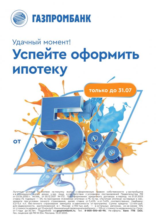 Газпромбанк предлагает ипотеку по ставке от 5% годовых в рамках специального пре...