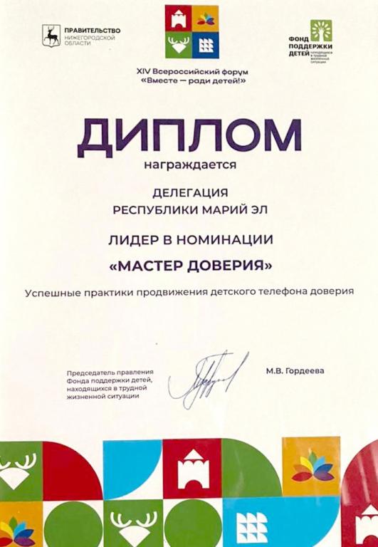Центр «Доверие» города Йошкар-Олы получили диплом в номинации «Мастер доверия». Практика продвижения детского телефона доверия нашего центра признана лучшей в стране.