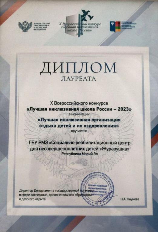 В финале «Журавушка» получил диплом лауреата этого федерального конкурса в номинации «Лучшая инклюзивная организация отдыха детей и их оздоровления — 2023». Заслуженную награду представителям центра вручила Светлана Гололобова, являющаяся сотрудником Федерального центра допобразования и организации отдыха и оздоровления.